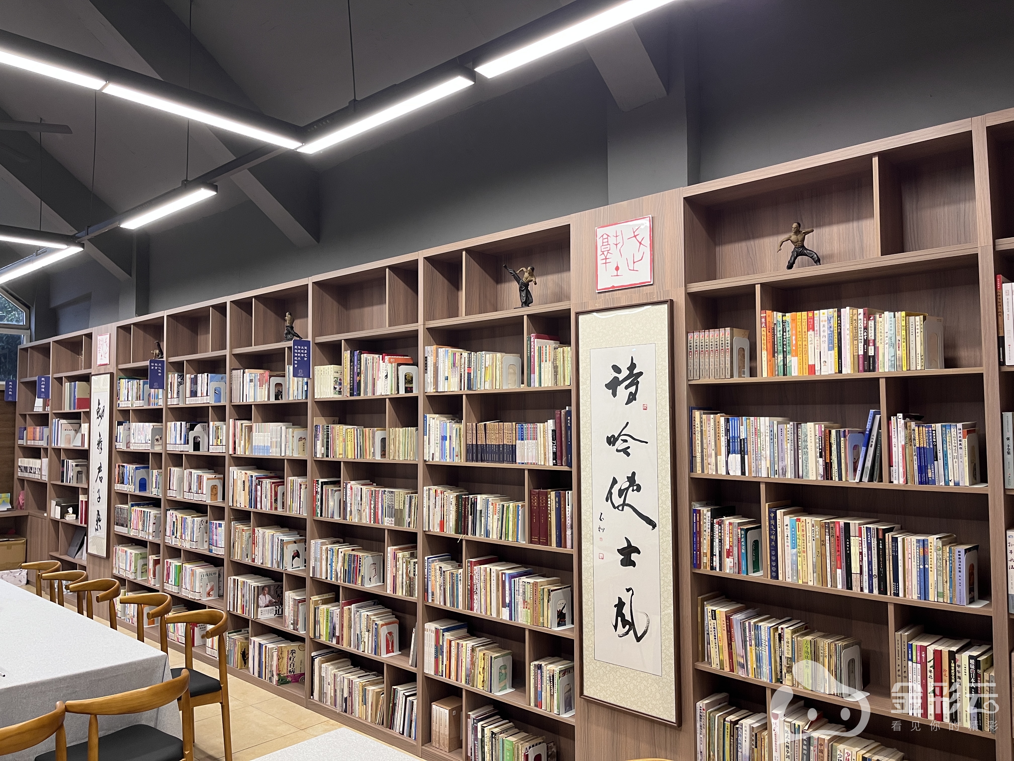 武塾书房与训练场的中间隔着一个茶室,一边动感,一边安静,互不干扰。武塾书房里可以找到武术教学工具书、武侠小说、武术杂志……6000多本藏书涵盖了武术的历史、理论、技法等多个方面。