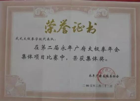 2004年,5月参加在石家庄举行的中日韩民间太极拳交流会,所在学校获团体优秀奖,获名家交流杯奖。
