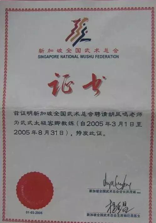 2005年,任新加坡全国武术总会客卿教练,参加第三届亚洲杯青少年武术锦标赛,作为名家为大会表演获表演纪念盾一枚。