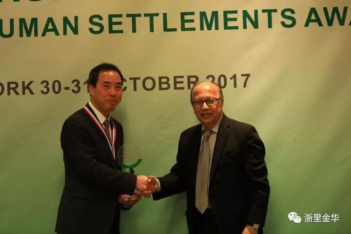 武义县委常委、常务副县长李杨勇从全球人居环境论坛主席、联合国前副秘书长暨高级代表安瓦尔•乔杜里大使手中接过“全球绿色城市”奖杯。