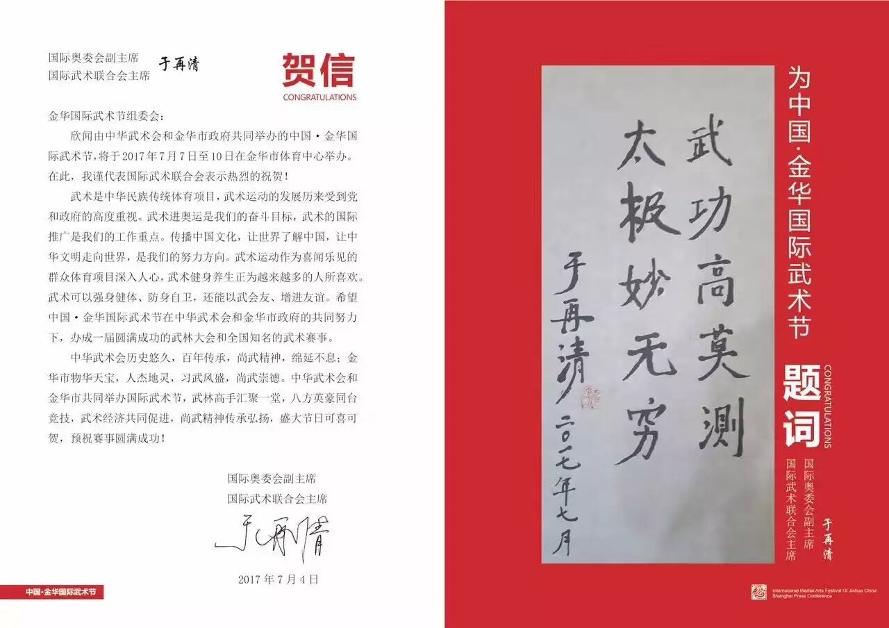 “武术运动作为喜闻乐见的群众体育项目深入人心,武术健身养身正为越来越多的人所喜欢。武术可以强身健体、防身自卫,还能以武会友、增进友谊。”国际奥委会副主席、国际武术联合会主席于再清在贺信中提到,武术运动的发展历来都受到党和政府的高度重视,武术进奥运、推向国际、传播文化一直是我们努力的方向。