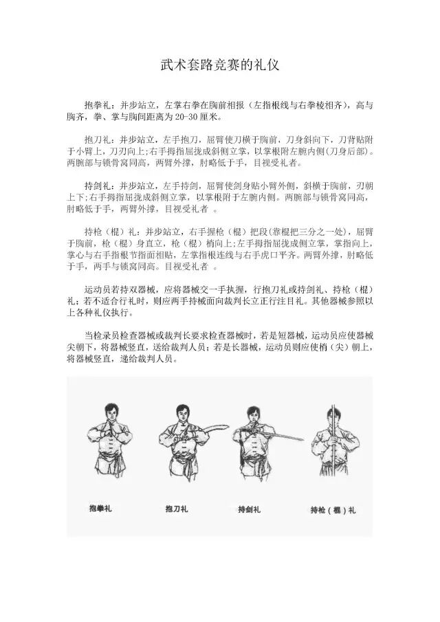 上场参赛选手,听到裁判叫号后,须向裁判长行抱拳礼,然后走到起势位置开始动作;完成套路后,转向裁判长再行抱拳礼后离开赛场,等待示分;如遇太极、木兰系列项目,长拳类初级类项目,或传统南拳、其它有关拳种传统套路运动幅度较小的项目,均要求安排2-6人同时上场比赛,选手听从裁判长的安排,到指定的起势位置(起势位编号标记),听到哨声后即开始动作。动作结束后即可离开场地。(附上场礼仪动作示范图)