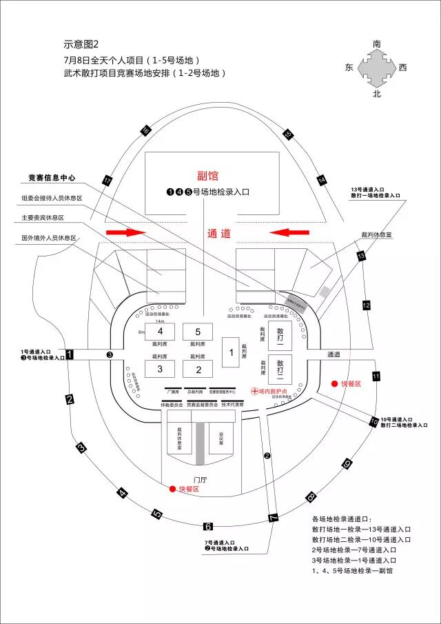 7月8日个人项目:1号、4号、5号场地检录处在体育馆副馆;2号场地检录处在体育馆北7号入口通道内;3号场地检录处在体育馆东面1号入口通道;.(见示意图2)。