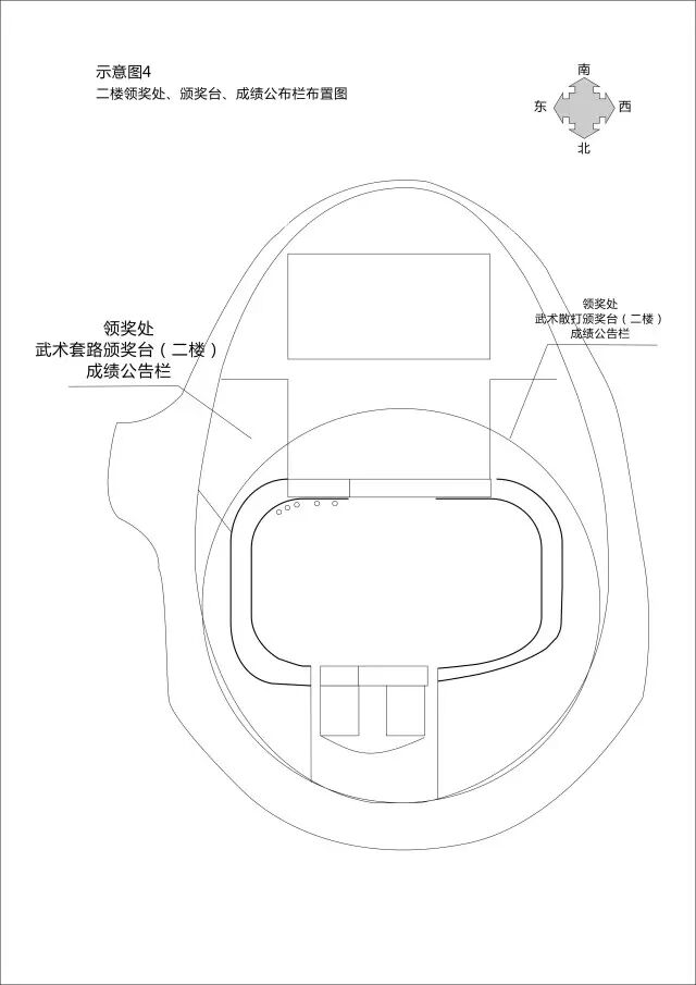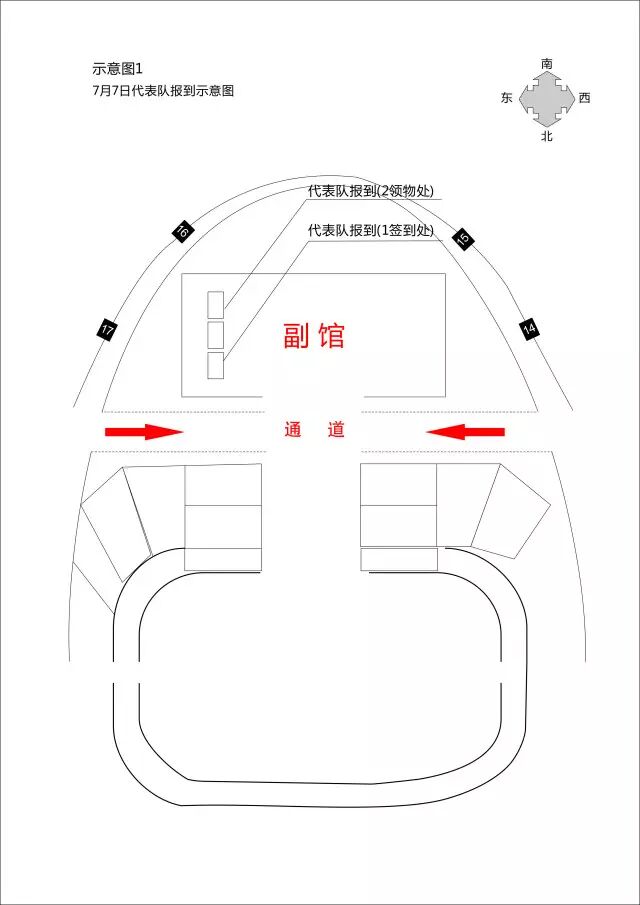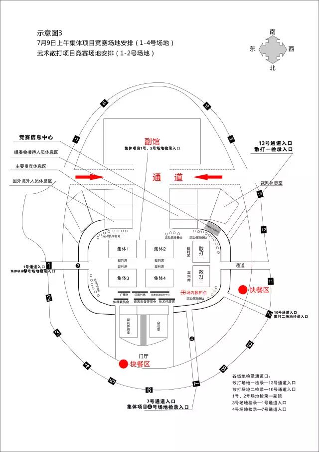 7月9日集体项目比赛:1号、2号场地检录处设在体育馆副馆。3号场地比赛检录处设在体育馆东1号入 口通道内。4号场地比赛检录处设在体育馆北面7号入口通道内。(见示意图3)
