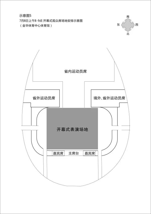 2017年7月8日上午在浙江省金华市体育中心体育馆举行“2017中国·金华国际武术节”开幕式。各代表队选派部分选手参加开幕式,请在7:40前进入体育馆指定位置由一名队员举队伍牌,其他运动员进入指定观众席,按区域在看台上就坐(见开幕式观众席安排示意图)。各场地前1至5组比赛的运动员不参加开幕式,8:40直接到各场地检录处检录。开幕仪式后,随即进行比赛。