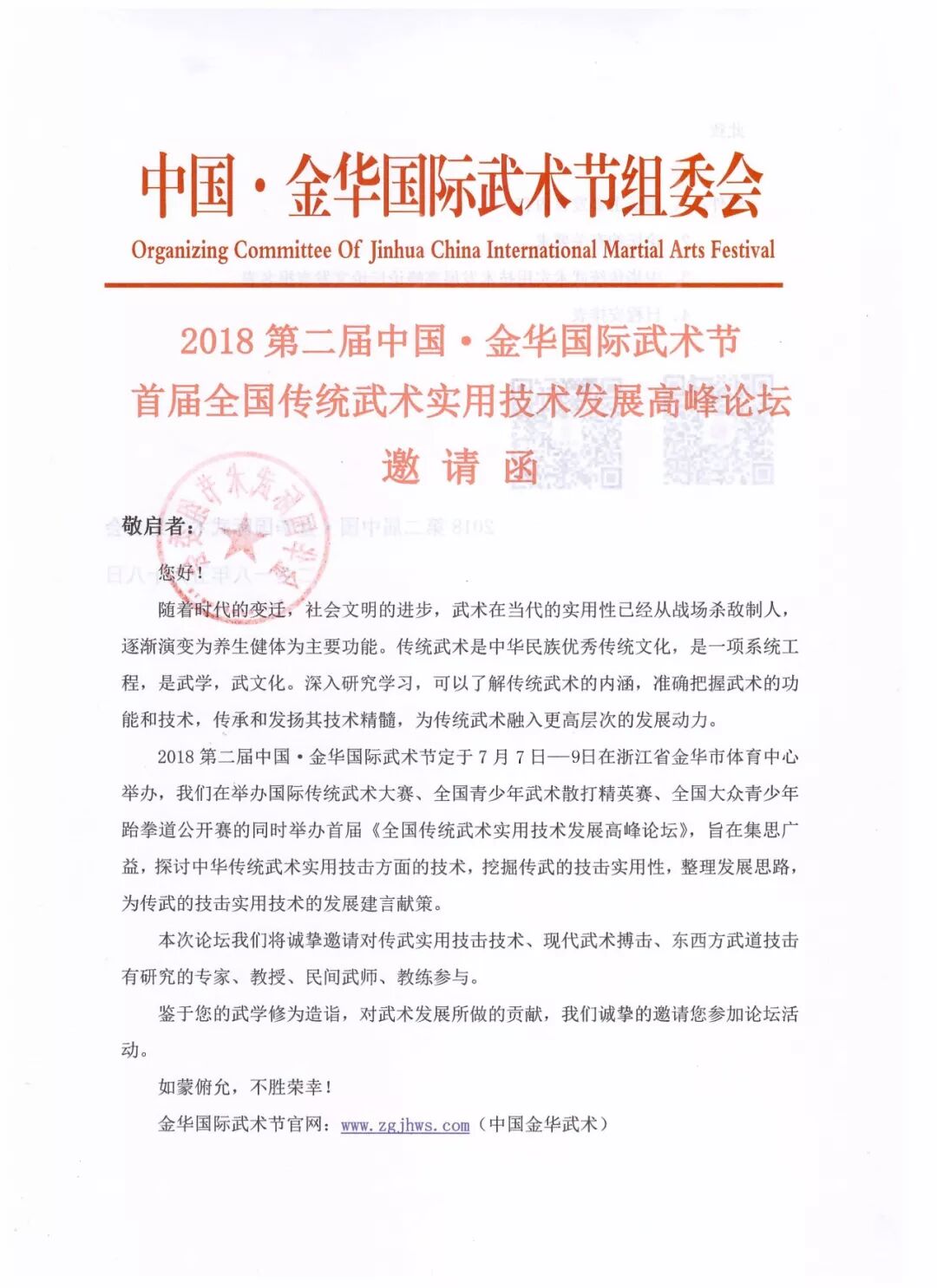 2018第二届中国·金华国际武术节定于7月7日—9日在浙江省金华市体育中心举办,我们在举办国际传统武术大赛、全国青少年武术散打精英赛、全国大众青少年跆拳道公开赛的同时举办首届《全国传统武术实用技术发展高峰论坛》,旨在集思广益,探讨中华传统武术实用技击方面的技术,挖掘传武的技击实用性,整理发展思路,为传武的技击实用技术的发展建言献策。