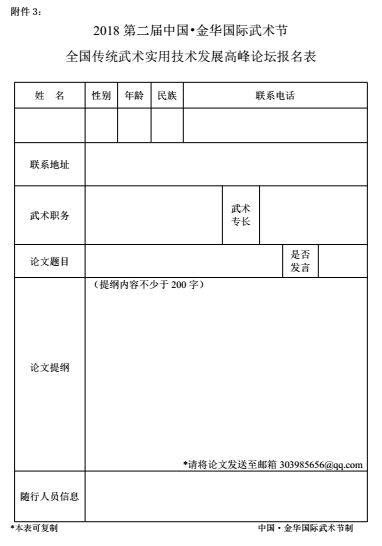 3、中华传统武术实用技术发展高峰论坛论文发言报名表