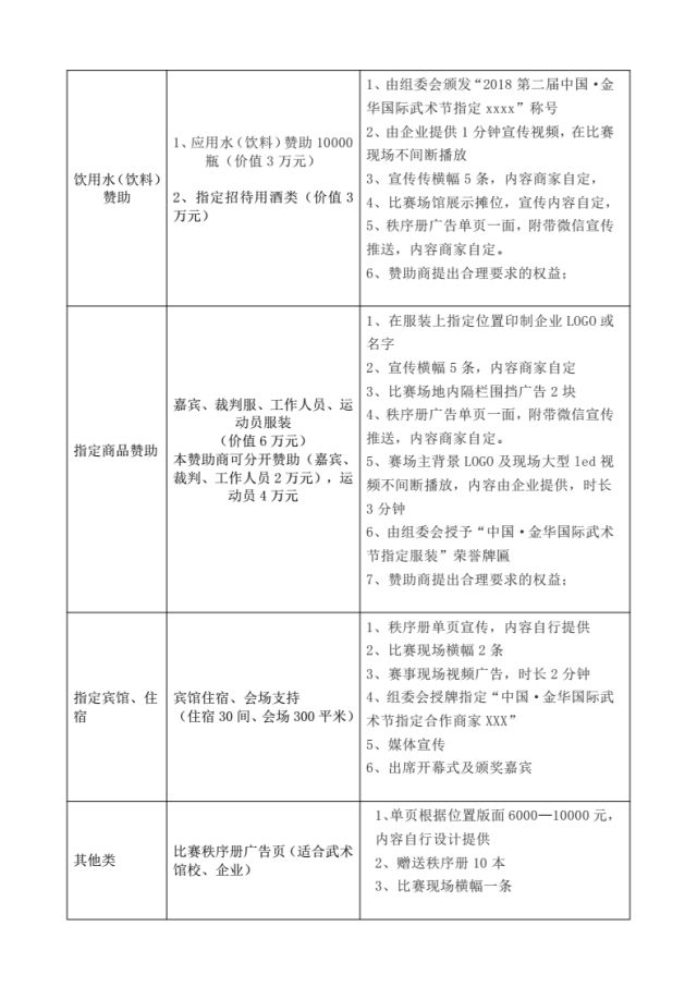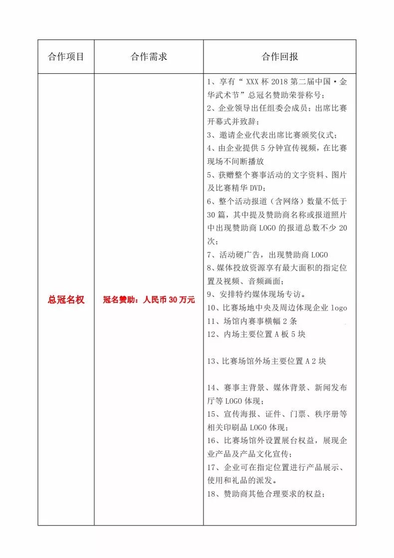 1、享有“ XXX杯 2018第二届中国·金华武术节”总冠名赞助荣誉称号;