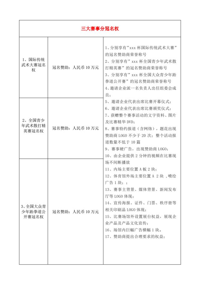 3、分别享有”xxx杯全国大众青少年跆拳道公开赛”的冠名赞助商荣誉称号