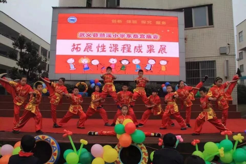 熟溪小学在四、五年级中开展了武术套路拓展课程,共计40名同学参与学习训练,同时也成立了由20名武术小达人组成的熟溪小学武术队,在2019年1月3日的东岳宫庙会上表演了《旭日东升》武术操和精彩的集体武术节目。