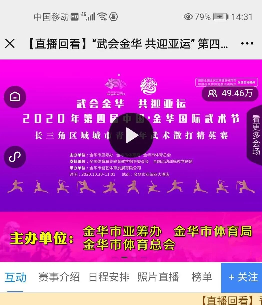 本届武术节两大赛事全程同步通过网络微信平台直播,由金湘文化传播公司执行,在两天的时间里,截止11月1日晚,通过网络平台直播观看赛事的人次达49.46万人次,这是一个非常强大的宣传通道,对赛事进行了有效的宣传作用,对树立“金华模式武术赛事”品牌起到了积极的推动作用。