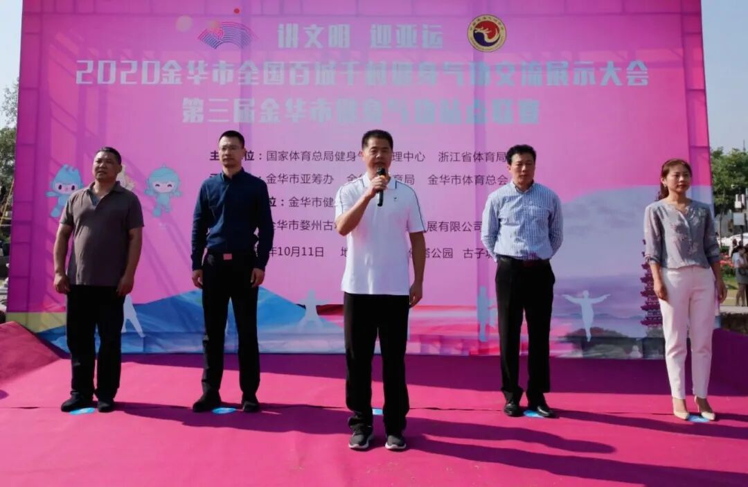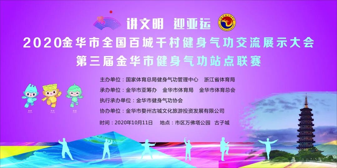在丹桂飘香,秋高气爽的金秋时节,10月11日,由国家体育总局健身气功管理中心、浙江省体育局;金华市亚筹办、金华市体育局、金华市体育总会承办,金华市健身气功协会执行承办,金华市婺州古城文化旅游投资发展有限公司协办的“讲文明、迎亚运”2020年金华市全国百城千村健身气功交流展示大会暨第三届金华市健身气功站点联赛在市区万佛塔公园和古子城保宁门广场隆重举行,本活动旨在营造全民迎亚运氛围,加强群众参与全民健身的热情,宣扬中国优良传统气功文化。